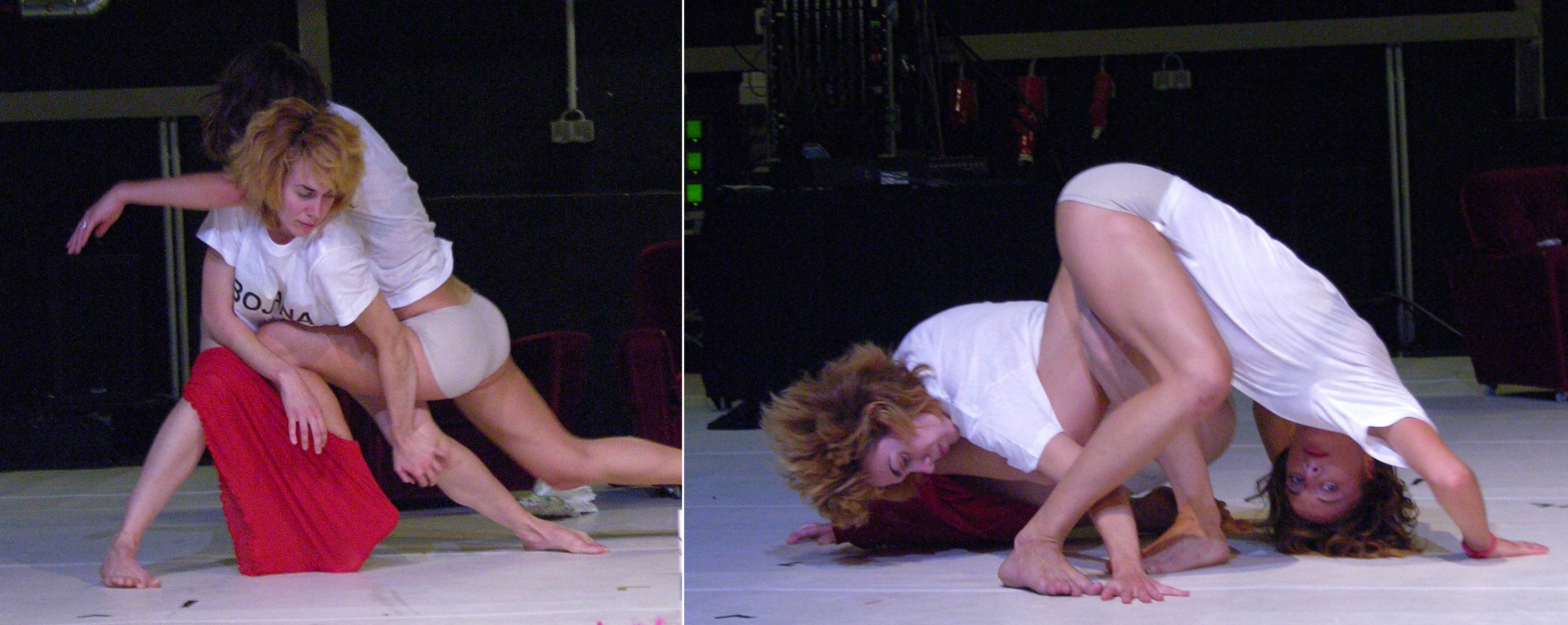 Dortmund, 7.09.2005![]() Klick für High-Resolution Image Der Besuch der Performance war nur nach vorheriger telefonischer Anmeldung möglich. Insbesondere zu Beginn schien es so, als ob es sich um den ersten Auftritt der Performerinnen handelte und sie erst dabei waren herauszufinden, was sie an diesem Abend eigentlich zeigen wollten. Der Eindruck war gewollt, denn das Verhältnis zwischen den Persönlichkeiten der Darstellerinnen und ihren Rollen war eine zentrale Gestaltungslinie der Performance. ![]() Als Schauspielerinnen stellen Bojana Mladenovic und Dragana Alfirevic zunächst sich selbst dar, schenken sich gegenseitig T-Shirts und lassen die Freude über die Bühne strömen. Ihre Rollenspiele beschäftigen sich hauptsächlich mit Kunst und Klischees. Zum Beispiel parodiert Bojana Mladenovic klassisches Ballett (Foto links) und macht sich über den Geschmack der 70er Jahre lustig, indem sie als Schaufensterpuppe von Dragana Alfirevic mit Kleidungsstücken und Symbolen aus dieser Zeit ausgestattet wird. Mit einem Song von ABBA im Hintergrund wird die Illusion perfekt (Fotos unten). ![]() Die quasi-improvisierte, stellenweise naiv anmutende "Moderierung" der eigenen Performance stellt einen Gegenpol zur Souveränität der tänzerischen und schauspielerischen Leistung der Performerinnen dar. Insbesondere in den schrägen Szenen haben sie viel zu bieten. Die meisten Tanzpassagen wurden von zwischenmenschlichen Beziehungen inspiriert, es geht auch um die Erfüllung von Erwartungen und um Abhängigkeiten. Die Spanne reicht von leicht zu deutenden Szenen wie dem Kampf zwischen zwei Raubkatzen oder der Machtausübung (z.B. wenn Dragana auf Bojanas Kommando Liegestützen macht) bis zu abstrakteren Choreografien. Die Titelfotos dokumentieren eine solche Tanzpassage, in der die Performerinnen an jeweils einem Bein einen Rock gemeinsam anziehen und dabei reizvolle Verflechtungen von Händen und Füßen entstehen lassen.