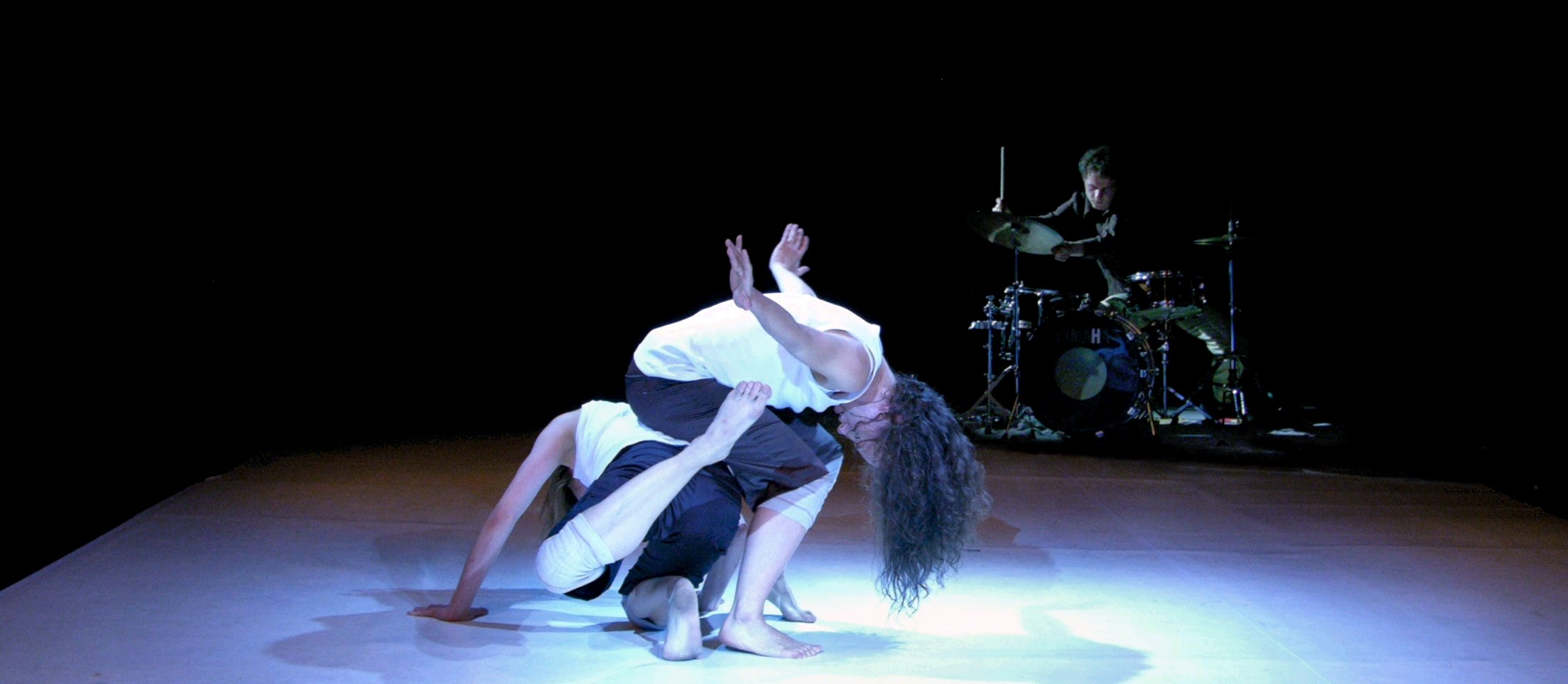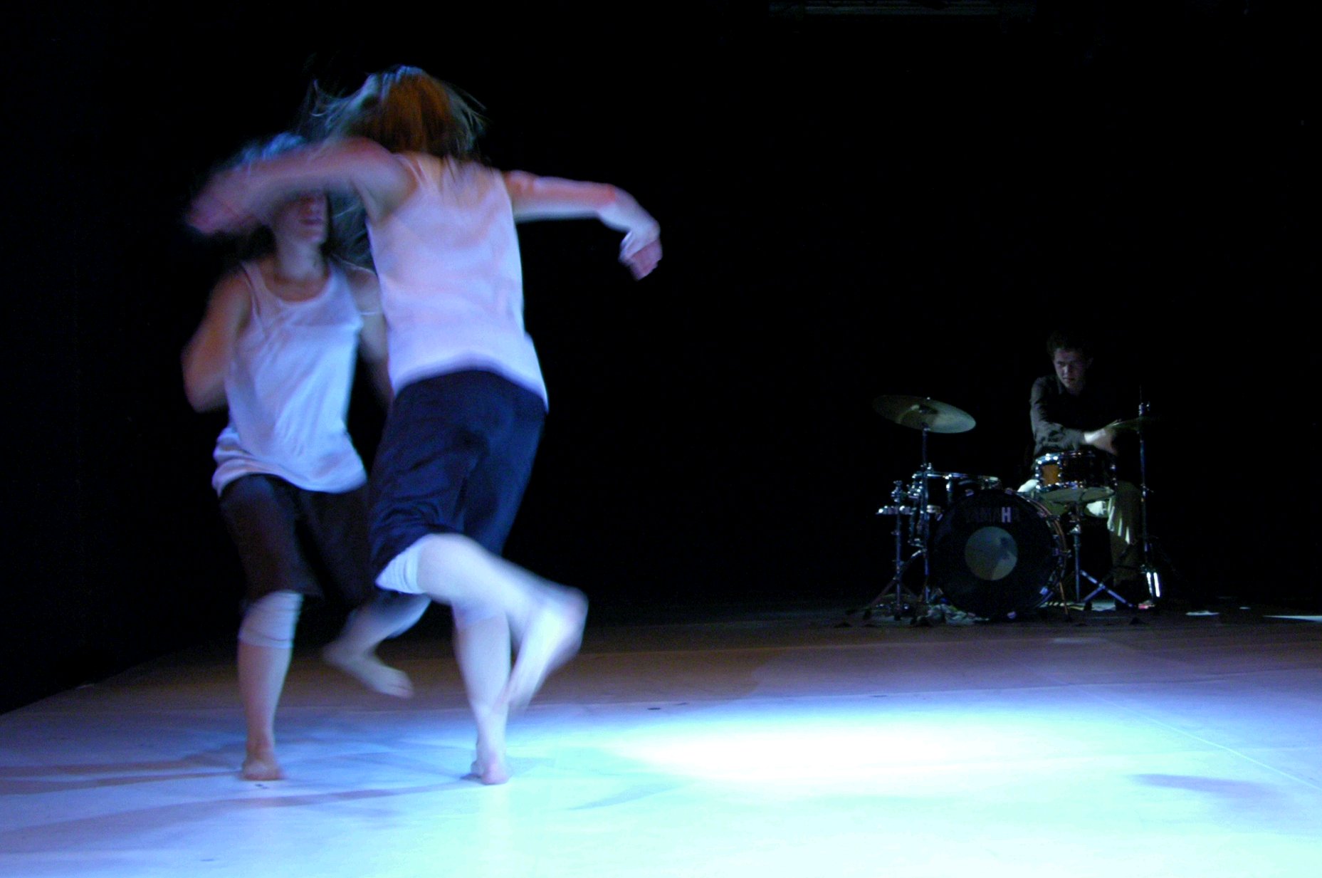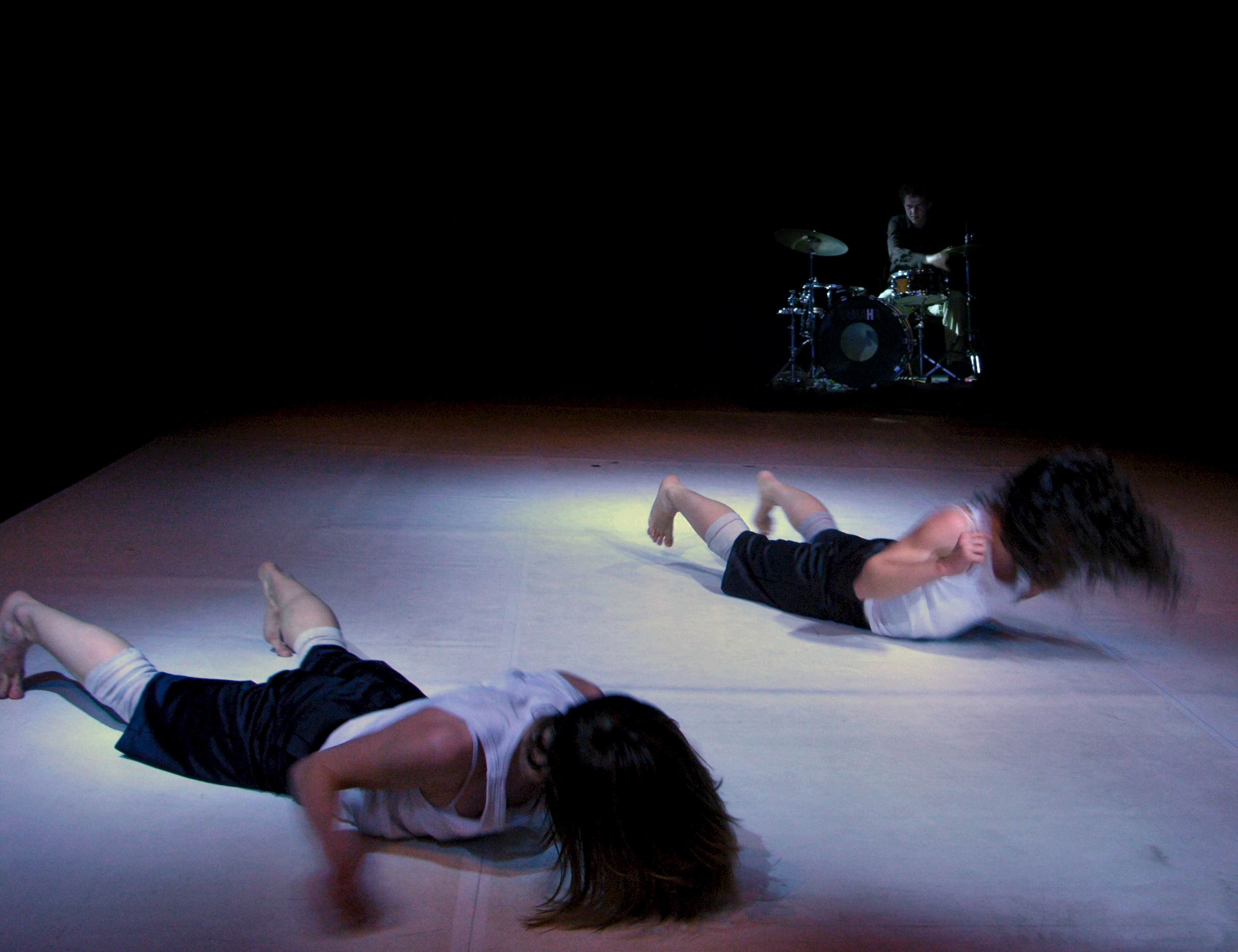 Percussions and dance interacted even more closely by jointly generating the rhythm in slow passages in the middle part of the performance. The dancers lying on their back on the floor were hitting the ground with their legs at the first beat of a four beats per bar rhythm, while Krishan was accenting the third beat on a bass drum. In a variation of this theme, the dancers used their arms and after getting up on their feet. It is not unusual for dancers to keep rhythm pulsing by stepping or jumping loudly in a steady rate, but Cynthia and Krishan brought the idea a step further by directly interlacing body-generated rhythm with instrumental percussions. In line with the functional role of loud breathing in controlling the rhythm in the first part of the piece, the interaction between dancers and percussionist substantiated the way in which rhythm was generated as a central and distinctive feature of the piece.